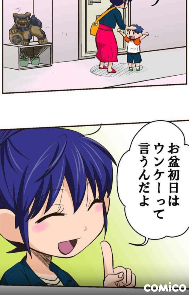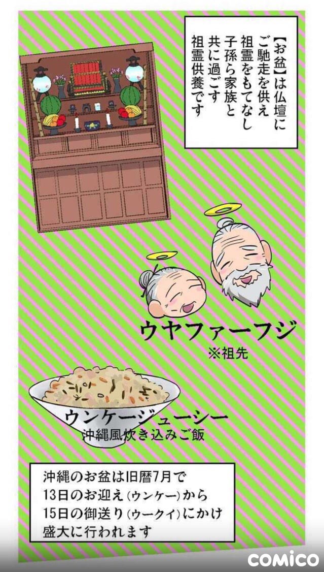 話は変わり、ウェブサイトの「comico」さんで週刊連載をしていた頃に、沖縄の旧盆の様子をマンガで描いておりましたのでこちらにアドレスをのせております。(沖縄に住む架空の家族の日常マンガです)